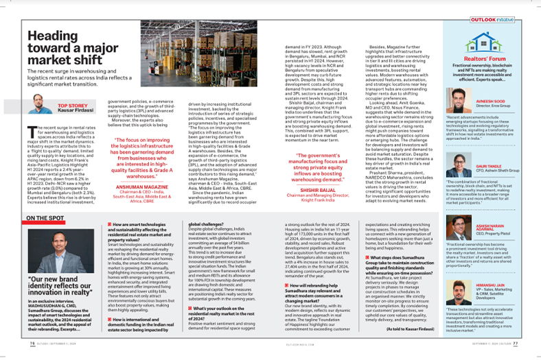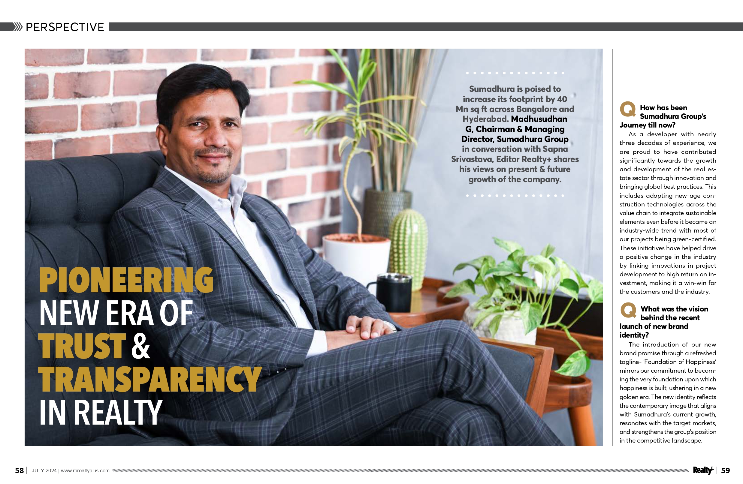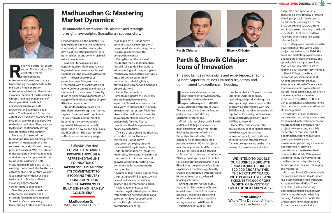 Mr. Madhusudhan G, CMD of Sumadhura Group, is featured in Outlook India magazine's "Young Game Changers of Indian Realty 2024" special August issue. This recognition reflects his innovative leadership and contributions to the real estate sector. In the feature, he discusses the Group's new identity, Sumadhura's pioneering industry-first initiative 'RealView', and shares insights into his hobbies and educational background.