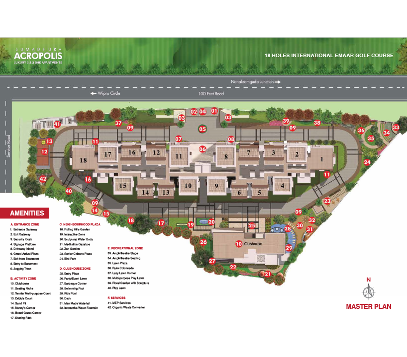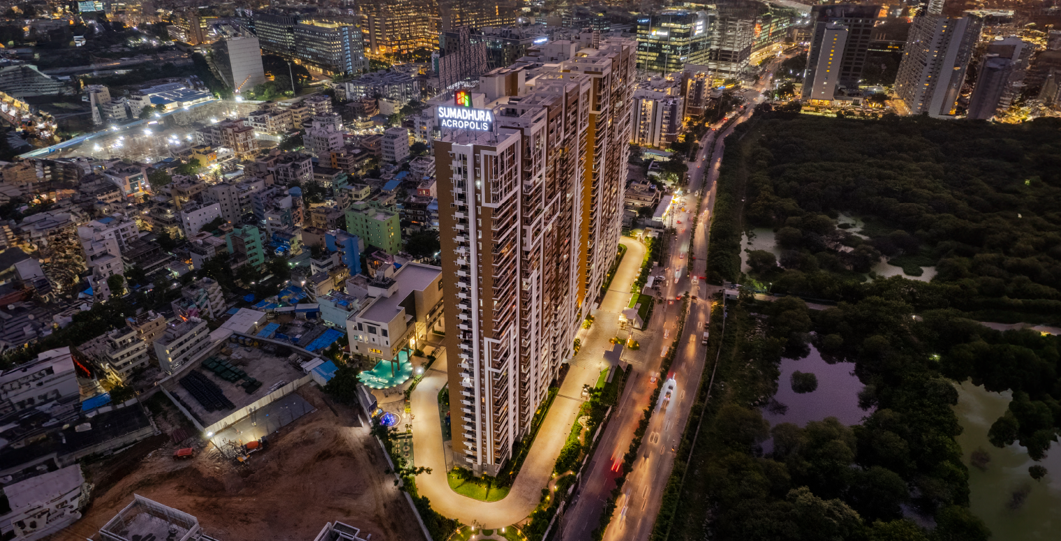 Rising 32 stories above Hyderabad's skyline, Sumadhura Acropolis is where luxury finds its true altitude. This architectural masterpiece in Nanakramguda offers meticulously crafted 2, & 3-bedroom sanctuaries, each framing spectacular views of rolling golf greens and city lights below.